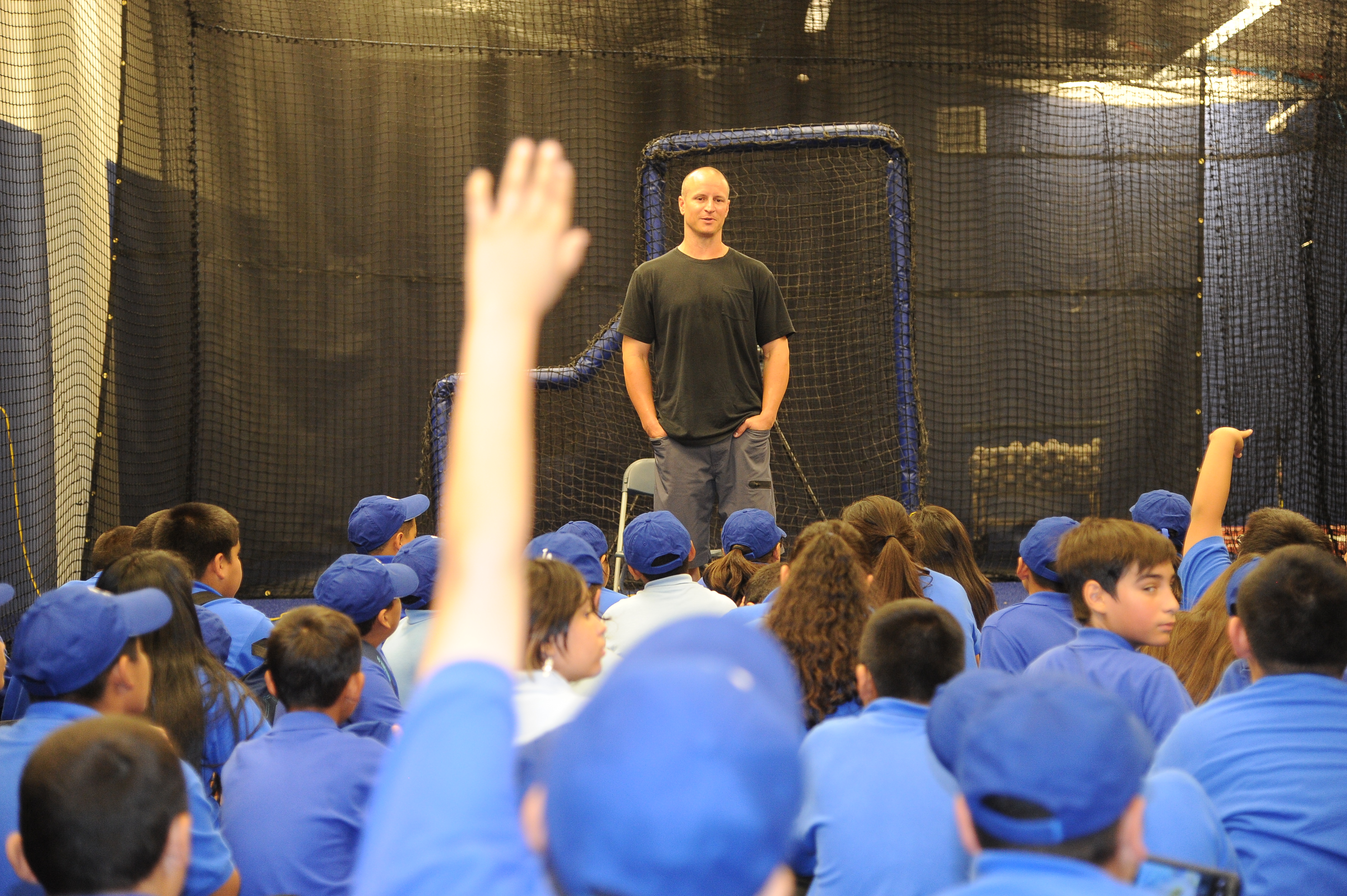 On August 27, the Dodger trainers hosted a Promoting a Lifetime of Activity for Youth (PLAY) Clinic for 6th graders from Irving Middle School, one of the Dodgers Communities of Schools. PLAY is a public awareness campaign of the Professional Baseball Athletic Trainers society (PBATS), in conjunction with the Taylor Hooten Foundation. The PLAY Campaign helps combat child obesity and promotes healthy living and decision making among youth. The Dodgers Head Athletic Trainer Sue Falsone was joined by Assistant Trainer Nancy Patterson Flynn, Nutritionist Justin Robinson, Strength & Conditioning Coach Greg Harrel and special guest, 2nd baseman Mark Ellis spoke to the kids and answered many great questions at the end of the clinic.