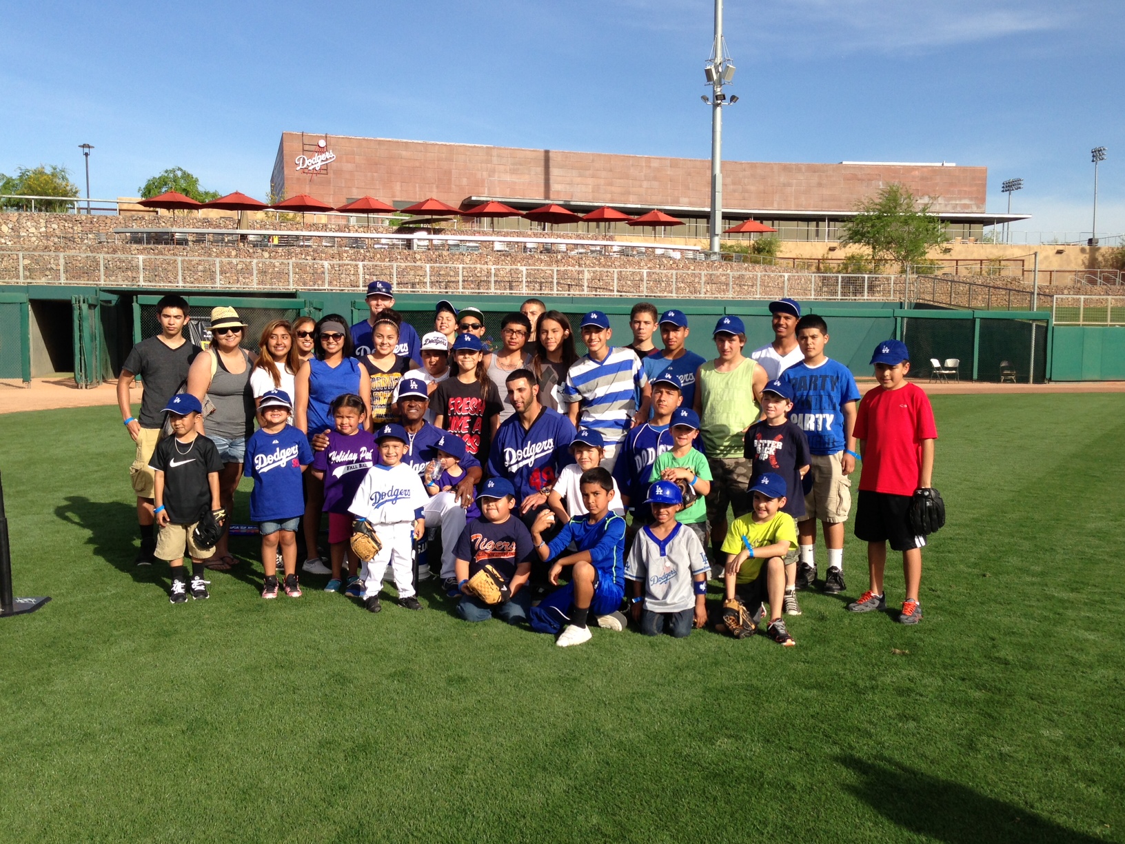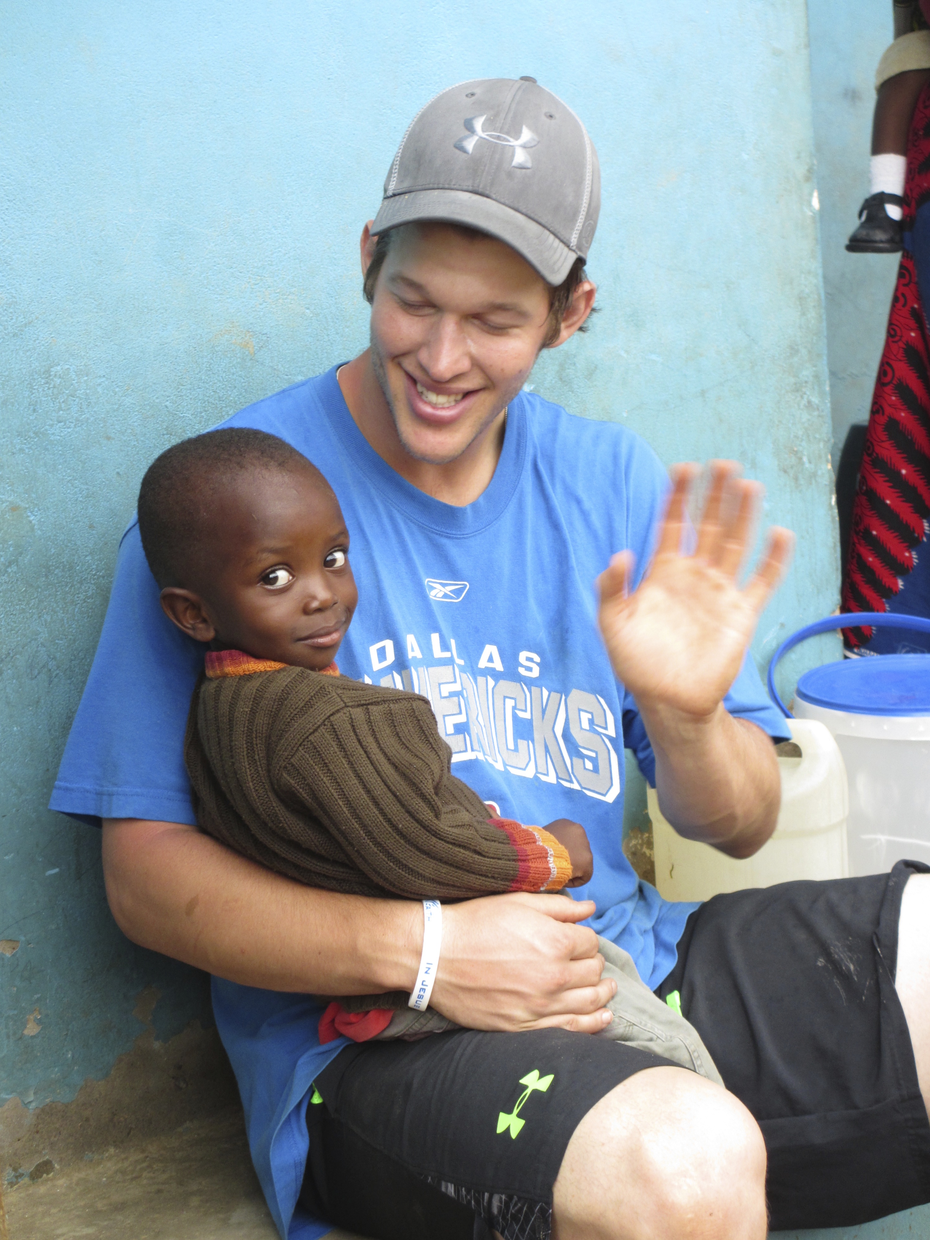 Kershaw shows orphanage resident Peter how to stretch before pitching.